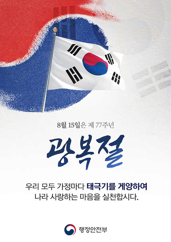행정안전부는 제77주년 광복절을 맞이해 국권회복을 경축하고 나라 사랑하는 마음을 되새기기 위해 오는 15일까지 ‘온 국민 태극기 달기 운동’을 전개한다고 3일 밝혔다.