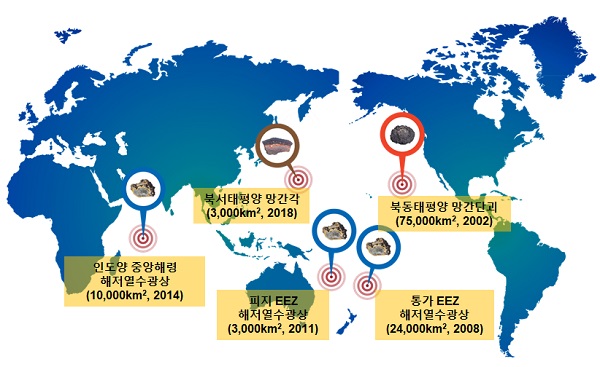 한편 우리나라는 태평양 및 인도양 공해와 태평양 도서국 EEZ에 5개의 독점탐사광구(11.5만㎢, 10만㎢인 남한면적의 1.15배)를 확보해 해양광물자원 탐사를 진행 중이다. 이 중 망간단괴·해저열수광상·망간각 3개의 광구는 국제해저기구와 계약을 체결해 추진하고 있다.