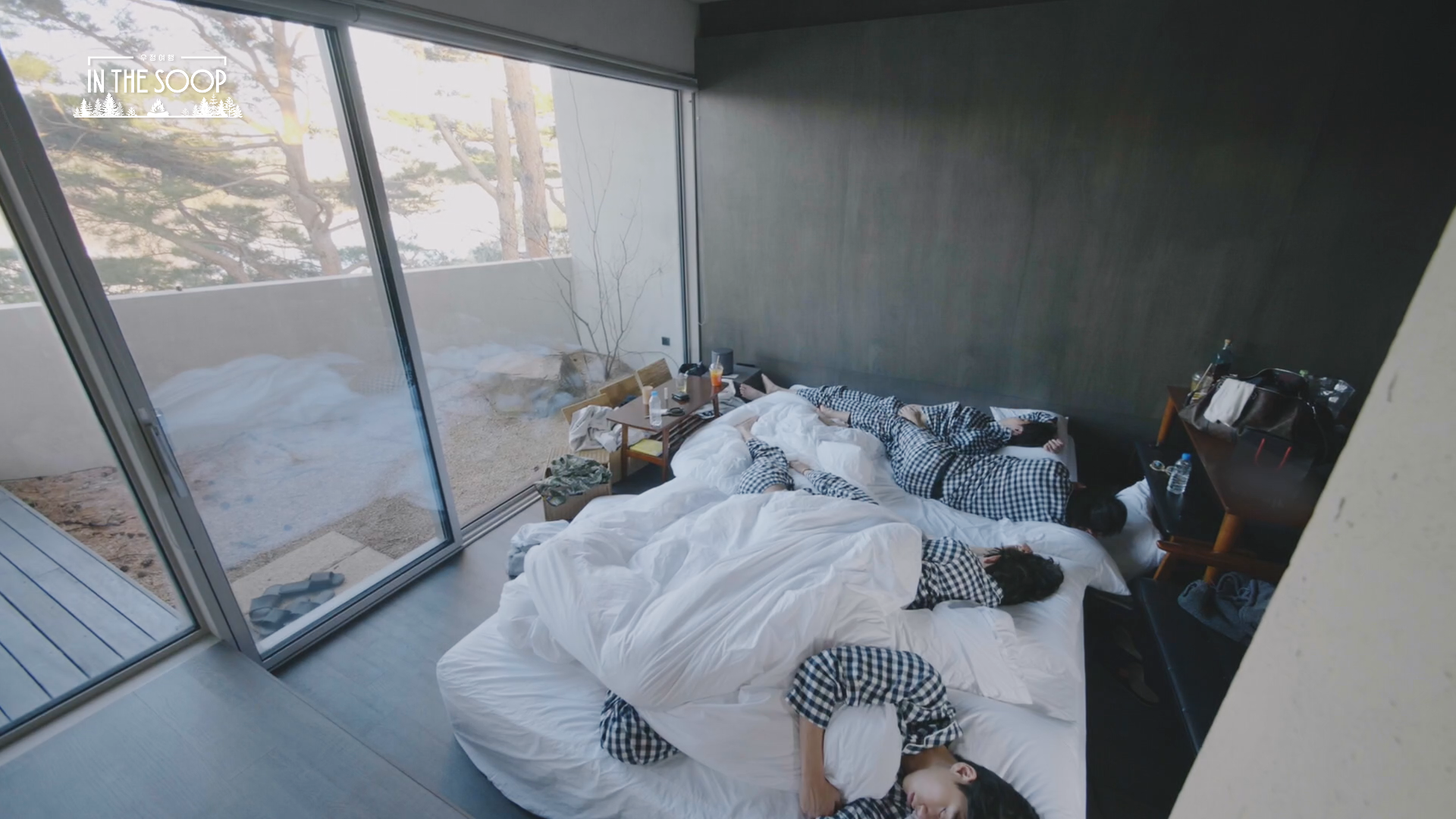 한편, 같은 파자마까지 맞춰 입은 다섯 친구들은 잠은 무조건 함께 자겠다는 각오로 직접 매트리스를 옮기며 한바탕 소동을 벌인다. 불 꺼진 방에 나란히 누워 그동안 못다한 이야기를 나누던 도중, 뷔는 갑자기 눈물을 보이고 마는데. 막내 뷔의 눈물에 생각이 많아진 친구들이 나누는 서로를 향한 진심 어린 이야기가 공개된다.