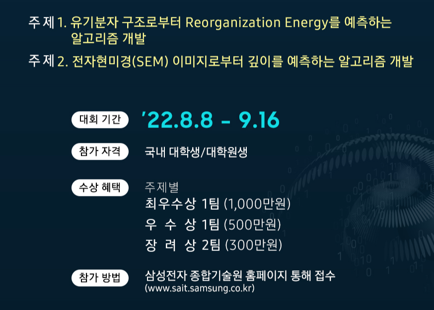 이번 ‘2022 삼성 AI 챌린지’의 공모 과제는 AI 기술을 활용한 △신소재 연구와 △컴퓨터 비전이다.