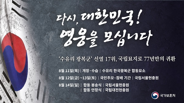 국가보훈처는 오는 11일부터 14일까지 나흘간 제77주년 광복절을 맞아 수유리 한국광복군 합동묘소에 있는 광복군 선열 17위를 국립대전현충원으로 이장한다고 8일 밝혔다.