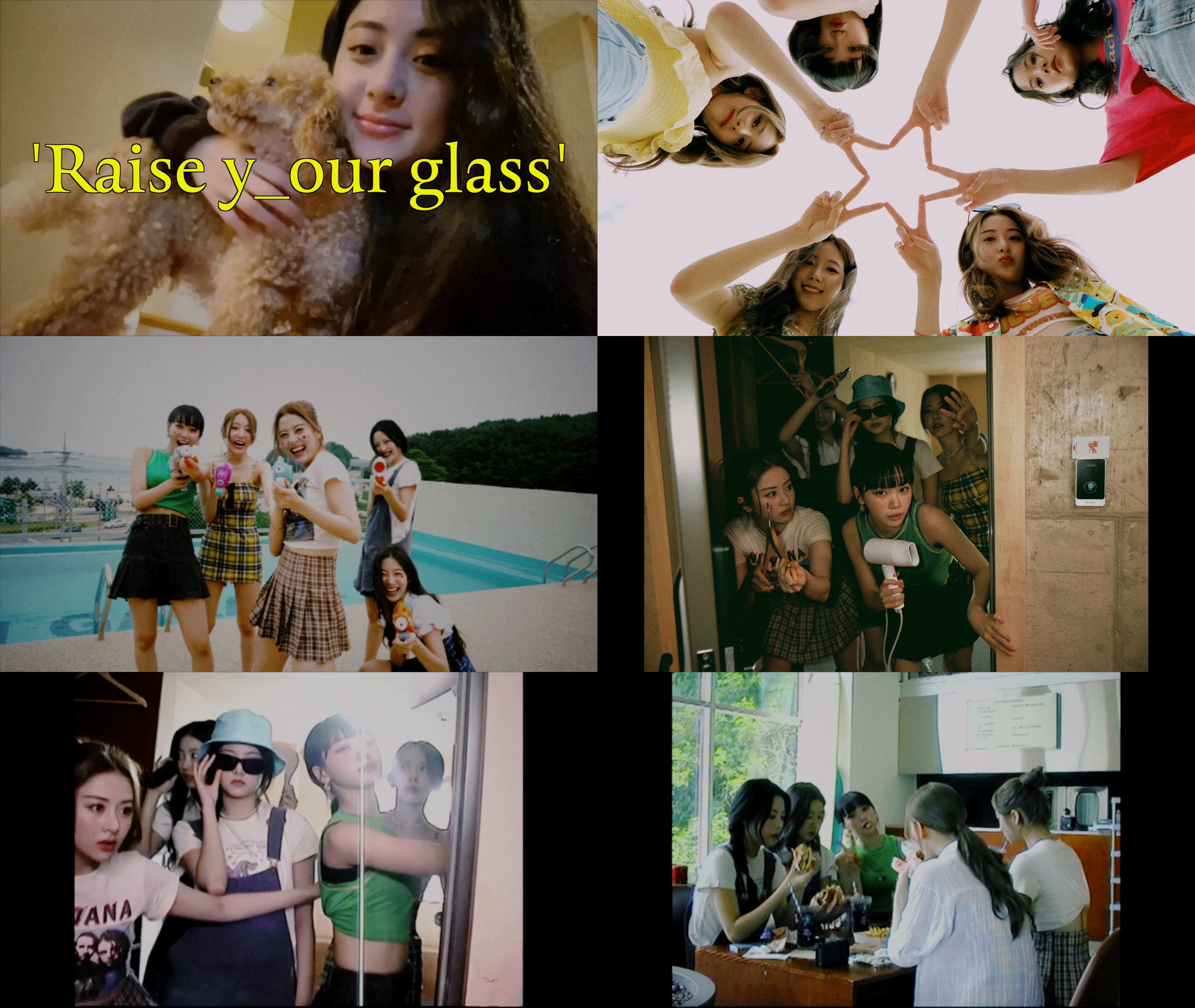 또한, 음원 공개와 함께 르세라핌 공식 유튜브 채널에 ‘Raise y_our glass’ 뮤직비디오가 게재됐다. 공개된 뮤직비디오는 르세라핌 멤버들의 연습생 시절부터 지금까지 성장해 온 과정을 담고 있다. 특히 바다로 여행을 떠난 장면 등 멤버들이 직접 촬영한 영상이 다수 포함돼 이들의 자연스러운 매력이 한껏 드러난다.