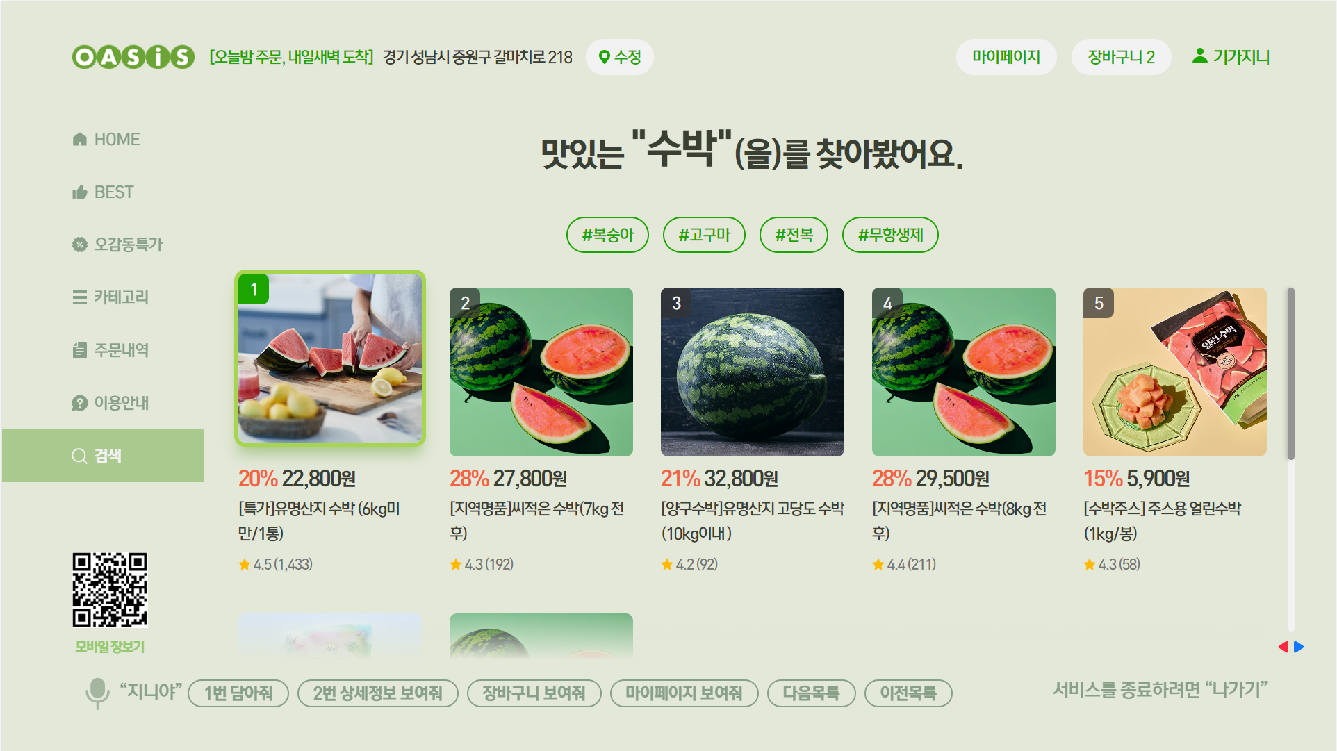 예컨대 “지니야, 오아시스마켓에서 유기농 우유 주문해줘”라고 말하면 AI 장보기 서비스가 실행되고, 이후 “담아줘”, “구매해줘”, “결제해줘” 세 단계의 음성명령만으로 다음날 7시까지 신선식품을 새벽에 배송 받을 수 있는 것이다.