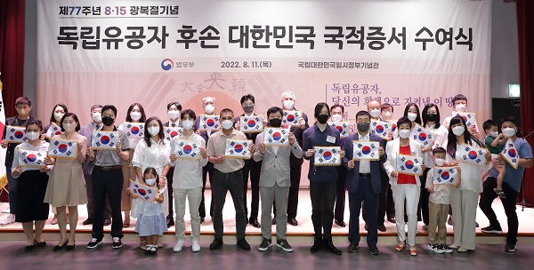 이번 수여식은 8·15 광복절을 맞이해 독립유공자들의 위대한 희생과 헌신에 보답하고 그 후손이 대한민국 국적을 받아 온전히 대한민국 국민이 되는 자리를 축하하기 위해 마련됐다.