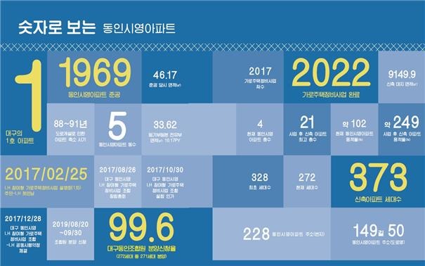 1969년 준공된 동인시영 아파트는 대구시의 현존 최고령 아파트로 총 5개동 272세대로 구성돼 있으며, 최초로 수세식 화장실이 설치되고 연탄운반을 위해 계단실 대신 경사로가 조성되는 등 60년대 우리나라 주거문화의 특징을 잘 보여주는 역사적 의미를 지닌 단지다.