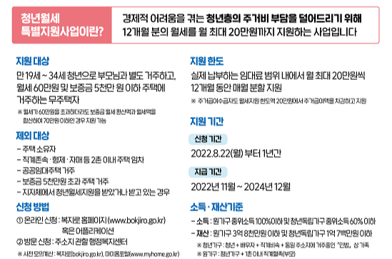 보증금 5000만원 이하, 월세 60만원 이하인 주택에 거주하는 경우 최대 20만원의 월세를 12개월 동안 지원한다.