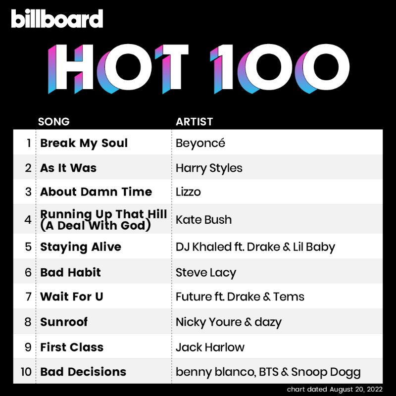 15일(현지시간) 공개된 미국 음악 전문 매체 빌보드 최신 차트(8월 20일 자)에 따르면, 방탄소년단 진과 지민, 뷔, 정국이 지난 5일 발표한 베니 블랑코, 스눕독과의 협업곡 'Bad Decisions'는 진입 첫 주 빌보드 '핫 100' 10위로 직행했다.
