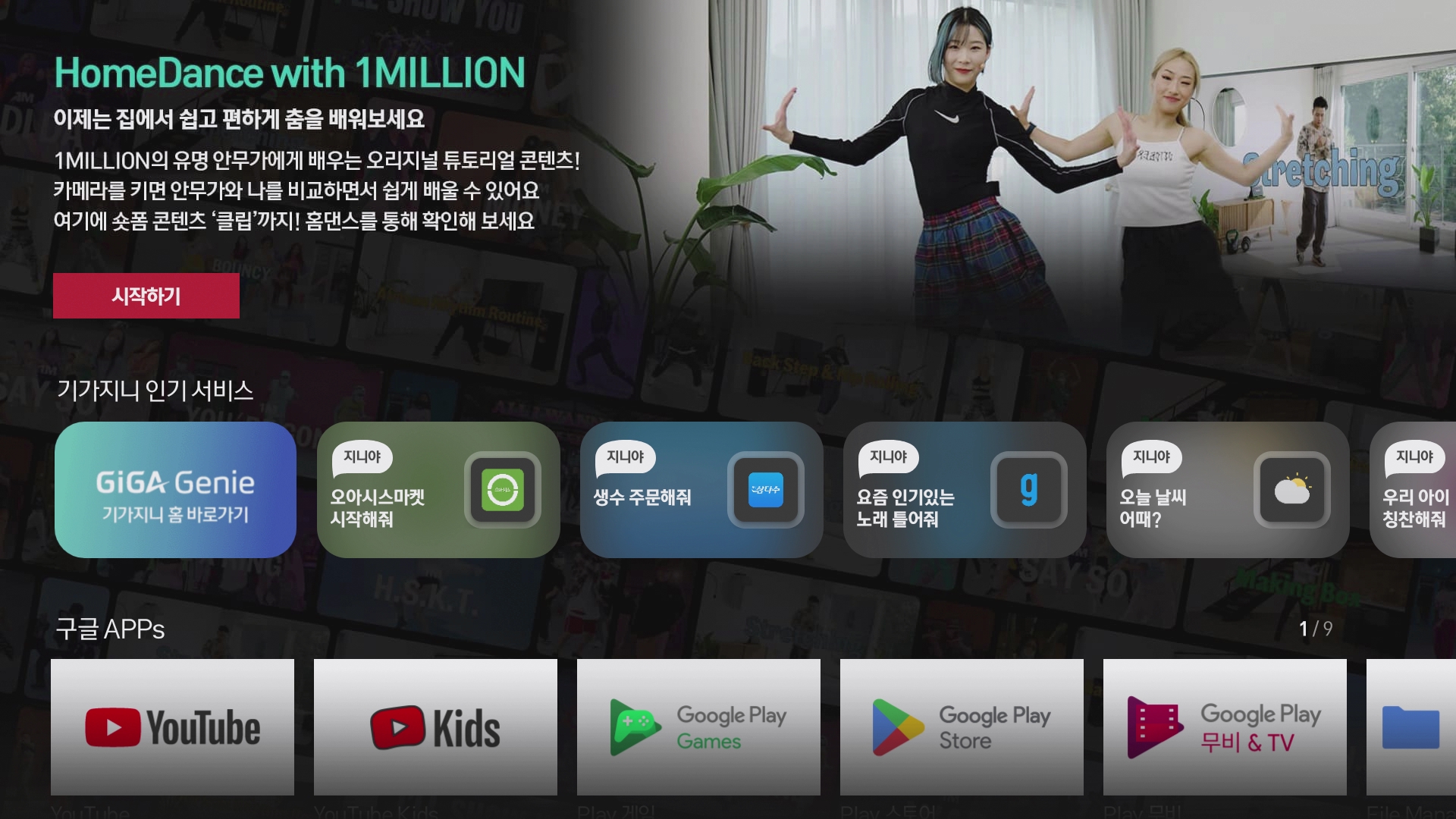 KT의 기가지니A, 기가지니3 셋톱박스를 이용하는 고객은 ‘원밀리언 홈댄스’ 앱을 실행시켜 원밀리언의 전문적인 댄스 강습을 집에서 시간 제약 없이 볼 수 있다. 또한 셋톱박스에 웹카메라를 연결하면 듀얼 스크린 미러 기능으로 안무가와 자기 모습을 비교하면서 연습할 수 있다.