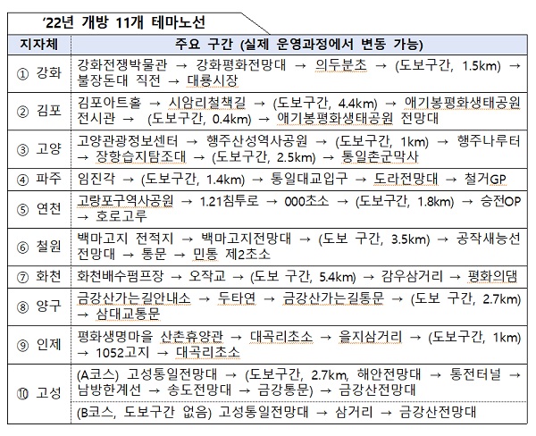 이번에 개방하는 ‘테마노선’ 11개에는 비무장지대 접경지역 지자체 10곳이 모두가 참여했다. 각 지자체는 전쟁과 분단의 아픔을 돌아보고 평화와 미래를 향한 노력을 현장에서 체험할 수 있도록 차별화된 대표 관광자원으로 노선을 구성했다. 모든 노선에는 참가자들의 안전을 확보하고 야생 동식물을 보호하기 위해 군부대 등의 협조를 받아 차량으로 이동하는 구간을 포함했다.