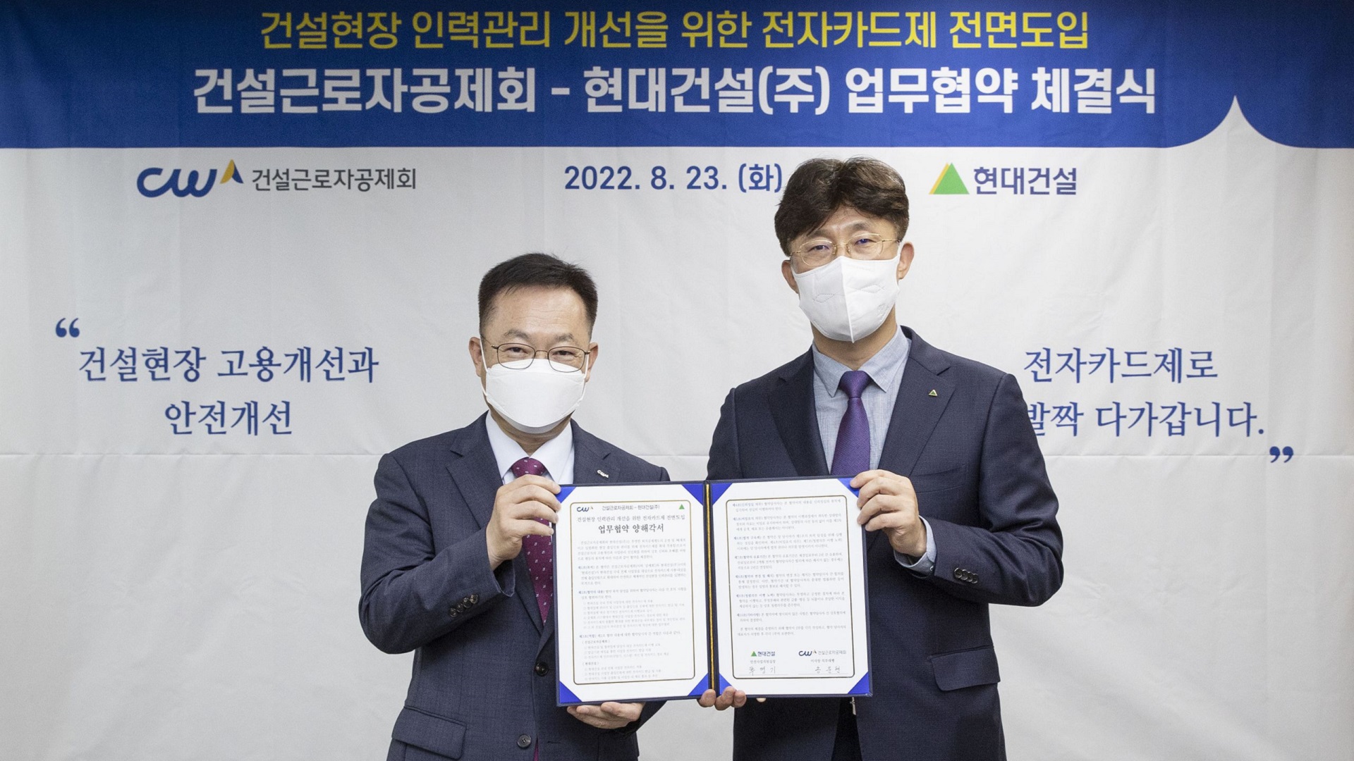 현대건설과 건설근로공제회(이하 공제회)는 23일(火), ‘건설근로자 편의와 현장 인력관리 개선을 위한 건설근로자 전자카드제 전면 도입 업무협약(MOU)’을 체결했다.