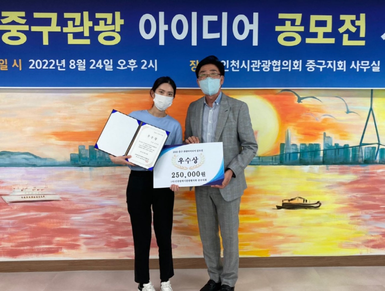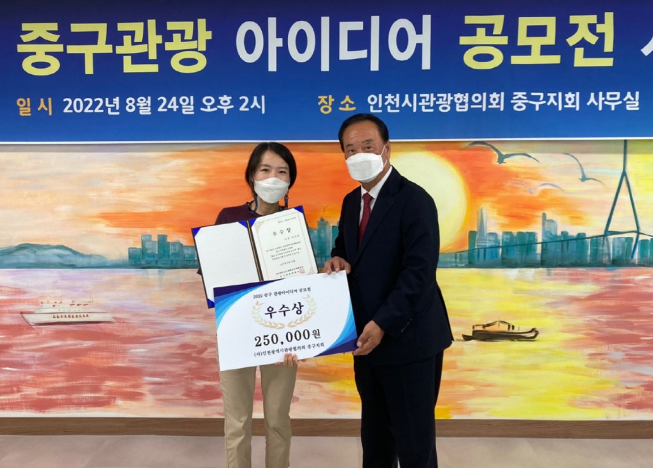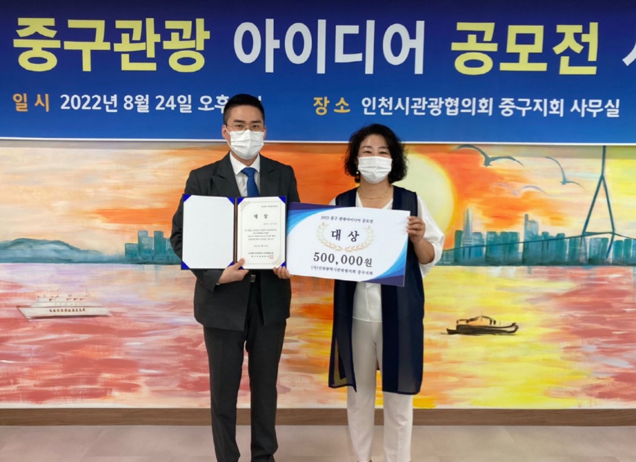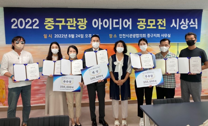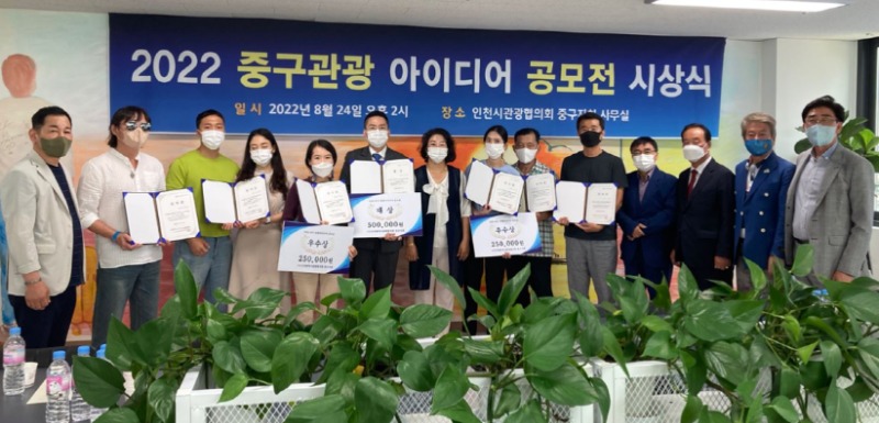 사단법인 인천광역시관광협의회 중구지회는 24일 오후 2시 중구지회 사무실에서 함의경 중구지회 회장, 남익희 고문(인천신문회장), 조광휘 시협의회자문(前인천시의원), 박현성 고문(도비엔터테인먼트회장), 유현종 고문(前영화감독), 이승룡 고문(영종 H2 발전협의회장)이 참석하고 수상자 등 20여 명이 참석한 가운데 ‘제1회 2022 중구관광아이디어 공모전’ 시상식을 개최했다고 밝혔다.