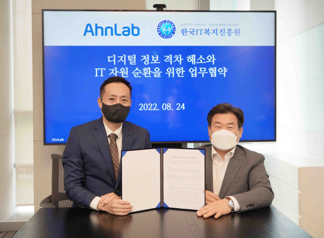 안랩이 24일 한국IT복지진흥원과 성남 지역 내 디지털 정보 격차 해소와 IT 자원 순환을 위한 업무 협약(MOU)을 체결했다고 25일 밝혔다.