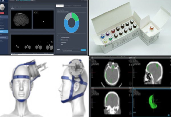 ▲ (왼쪽 위부터 시계방향으로)혁신의료기기로 지정된 제이엘케이의 뇌영상검출·진단보조소프트웨어, 노보믹스의 종양관련유전자검사시약, 코어라인소프트의 뇌영상검출·진단보조소프트웨어, 뉴로소나의 집속형초음파 자극시스템