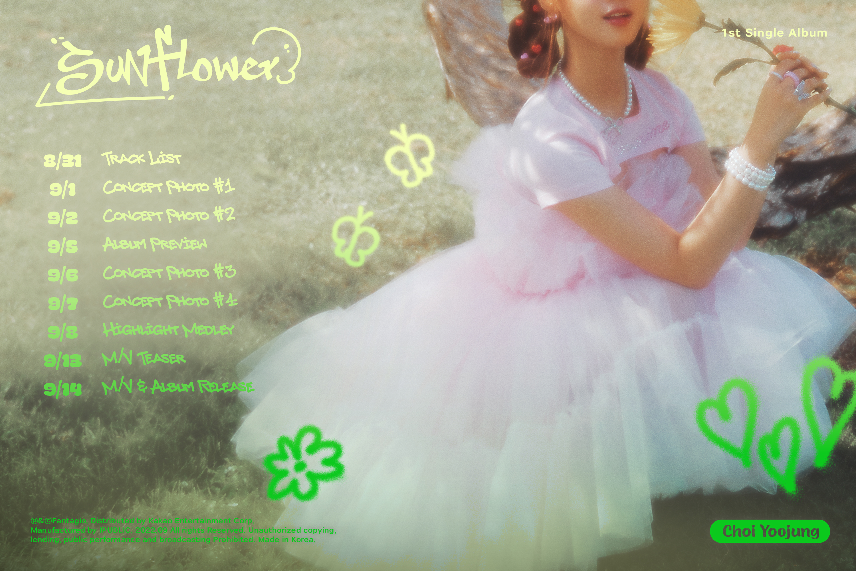 스케줄러에 따르면, 최유정은 9월 14일 싱글 1집 ‘Sunflower’ 정식 발매 전까지 트랙리스트, 4종 콘셉트 포토, 앨범 프리뷰, 하이라이트 메들리, 뮤직비디오 티저 등 다채롭고 알찬 티저를 순차적으로 선보인다. 최유정이 어떤 콘텐츠와 감성으로 ‘Sunflower’를 만들어갈지 관심이 모아진다.