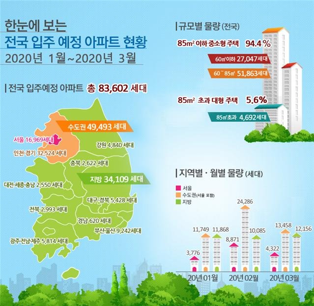 '20년 1월~3월 전국 아파트 83,602세대, 서울 아파트 16,969세대 입주 예정