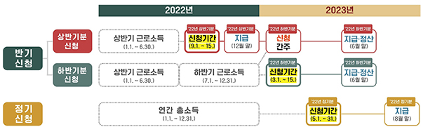 근로장려금 신청은 정기·반기신청으로 구분된다. 근로소득만 있는 자(배우자 포함)는 정기·반기신청 중 선택할 수 있으나 근로·사업·종교인 소득이 같이 있다면 정기 신청만 가능하다. 3.3% 원천징수 대상인 인적용역 사업자는 정기신청 대상에 해당된다.
