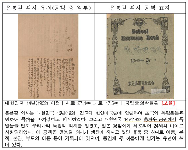 국립대한민국임시정부기념관에서 한중수교 30주년을 맞아 대한민국 보물로 등록된 윤봉길 의사의 자필 이력서와 유서를 비롯한 백범일지 초판 서명본 등을 일반에 공개한다.
