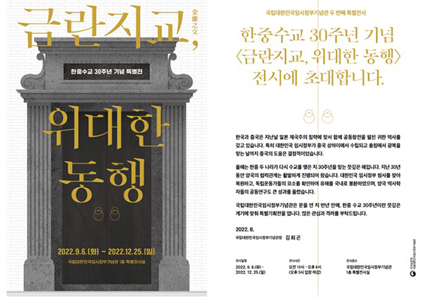 김희곤 국립대한민국임시정부기념관장은 “한중수교 30주년을 기념해 개최하는 특별전에 많은 국민이 찾아 대한민국 임시정부의 역사와 가치를 함께 기억하고 되새기는 소중한 기회가 되기를 기대한다”고 밝혔다.