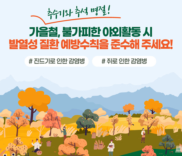 질병관리청은 추석 명절 등 야외활동이 많아지는 가을철에 환자 발생이 급증하는 진드기·쥐 등에 의한 감염병을 예방하기 위한 예방수칙 준수를 당부했다.