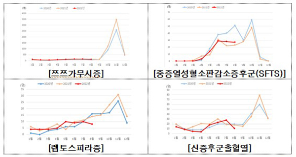 발생은 주로 6~10월에 집중되는데, 올해는 매개체인 참진드기 밀도가 최근 5년간의 평균에 비해서는 4.0% 낮은 수준이지만, 전년 동기간 대비 2배 가까이 높은 수준으로 주의가 필요하다.