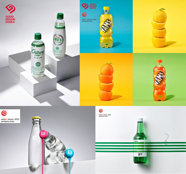 수상한 ‘칠성사이다 미니병’은 글로벌 친환경 페인트 기업과 협업해 기존 브랜드 색상에서 벗어나 다채로운 컬러들을 사용해 트렌디한 브랜드로의 변화를 시도했고, ‘처음처럼 꿀주’는 꿀을 따라가는 벌의 흔적을 디자인 모티브로 활용해 라벨과 뚜껑에 꿀맛이 난다는 제품 특성을 반영한 디자인으로 표현했으며, 본상 수상작중 하나인 ‘탐스 제로’는 ‘우수 디자인 어워드’ 수상에 이어 ‘레드닷 디자인 어워드’까지 2곳에서 연속으로 수상하게 됐다.