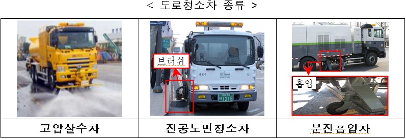 도로청소는 고압살수차, 진공노면청소차, 분진흡입차 등을 이용한다. 기온이 5℃ 이상인 경우에는 진공청소(분진흡입 등)와 물청소를 병행하고 5℃ 미만인 경우에는 물청소를 하지 않는다.
