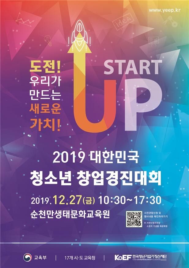 교육부는 12월 27일(금) 전남순천만생태문화교육원에서 17개 시·도교육청 및 한국청년기업가정신재단(이사장 황철주)과 함께 ‘2019 대한민국 청소년 창업경진대회’의 본선행사를 개최한다.