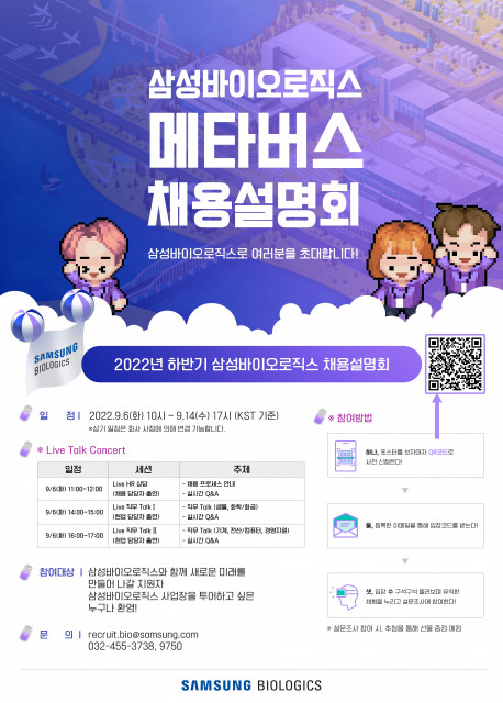 삼성바이오로직스에 관심이 있는 지원자라면 누구나 채용설명회에 참여할 수 있으며, 다양한 콘텐츠를 접할 수 있다. 삼성바이오로직스 공식 홈페이지 및 SNS채널에 게시된 포스터의 QR코드를 통해 참가 신청을 하면, 메타버스 접속 주소 및 입장 코드를 제공받을 수 있다.