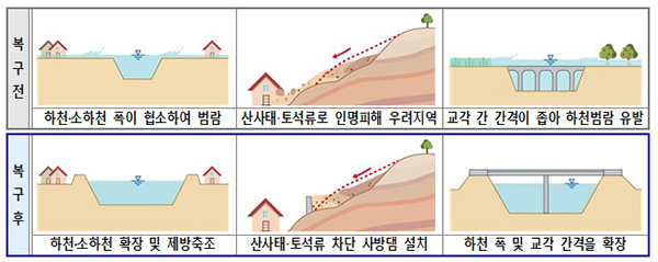 또 산사태·토석류 차단을 위해 사방댐 26곳을 설치하고, 하천이 좁아 범람 피해가 컸던 지역을 중심으로 하천 폭을 확장하고 협소한 교량을 넓혀 유수 소통이 원활해질 수 있도록 한다.