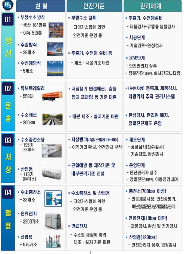 수소를 생산하는 수소 추출기 등 수소생산기지는 설비의 특성을 고려한 글로벌 수준의 안전기준이 마련된다. 생산 제품마다 전수검사를 하고 수소충전소 수준의 안전성 평가와 이중 모니터링 체계를 도입한다.