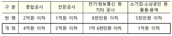 하지만 신속한 계약집행을 통한 경제활력 제고 및 영세기업 참여 확대를 위해서는 특례를 제도화할 필요가 있어 지방계약법 시행령에 소액수의계약 한도를 상향 규정하기로 했다.