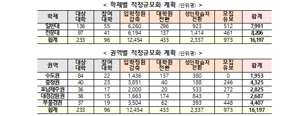 적정규모화 계획 인원은 일반대 7991명, 전문대 8206명으로 총 1만 6197명이다.