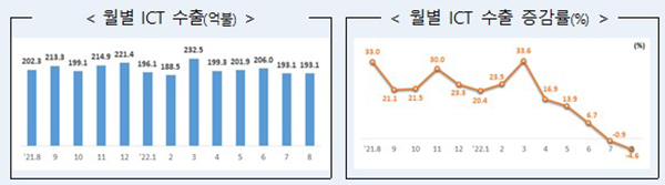 8월 ICT 수출은 전년 동월대비 4.6% 감소한 193억 1000만 달러였고, 일평균 수출액도 8억 달러로 전년 동월 대비 8.6% 감소했다.