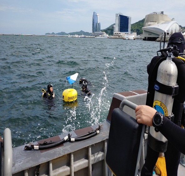 서해해경특공대는 휴일인 7일 오픈워터 수영대회 개최장소인 여수 오동도 주변 해역에서 해경 중앙해양특수구조단 잠수지원함정을 비롯해 수중 영상전송장비, 여수해양연구센터의 수중드론(로봇) 등을 동원해 수중 점검을 벌였다.