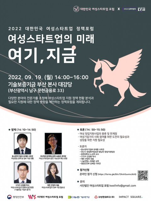 사단법인 여성스타트업 포럼(이하 여성스타트업 포럼)은 여성 창업 생태계의 발전과 전국 단위 활성화 방안 마련을 위해 9월 19일 부산 기술보증기금 본사에서 ‘여성스타트업의 미래-여기, 지금’이라는 주제로 정책 포럼을 개최한다고 밝혔다.