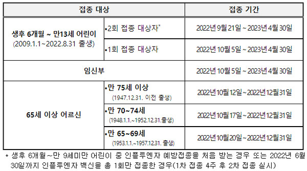 이번 절기의 인플루엔자 국가예방접종 대상은 생후 6개월부터 만 13세 이하 어린이, 임신부, 65세 이상 어르신을 대상으로 연령대별로 순차적으로 접종을 시행한다.
