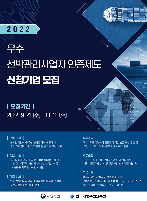보다 자세한 내용은 한국해양수산연수원 누리집의 ‘우수 선박관리사업자 인증제도 가이드북’을 확인하면 된다.
