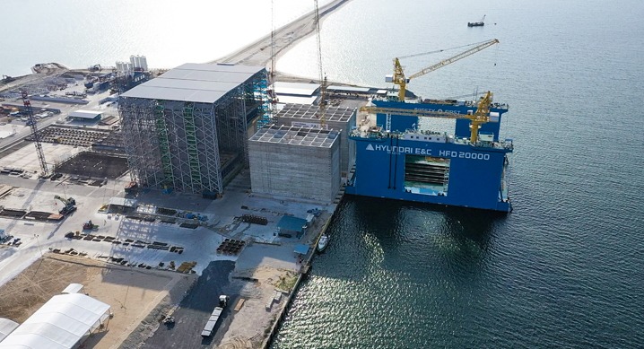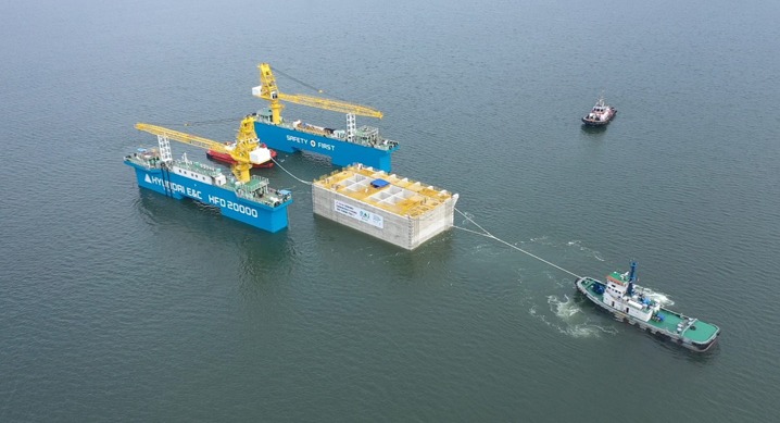 케이슨 이동 시, 자체 보유한 플로팅 도크(2만톤)를 활용해 육상에서 제작한 케이슨을 바다로의 이동을 용이하게 한 방법도 현대건설의 강점이다.
