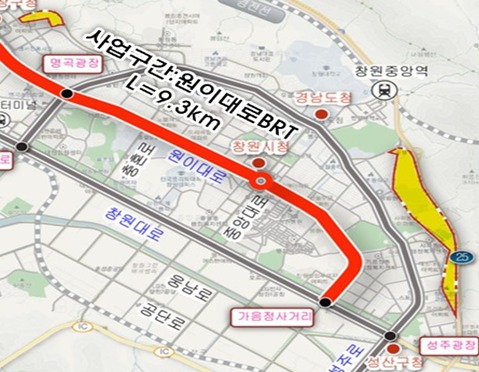 ② 창원 BRT(창원시 도계광장∼가음정사거리, L=9.3km) 는 주요 간선도로에 개발계획을 수립 중인 노선으로, S-BRT로 고급화하여 대중교통망이 개선되고 통행속도가 향상될 것으로 기대된다.