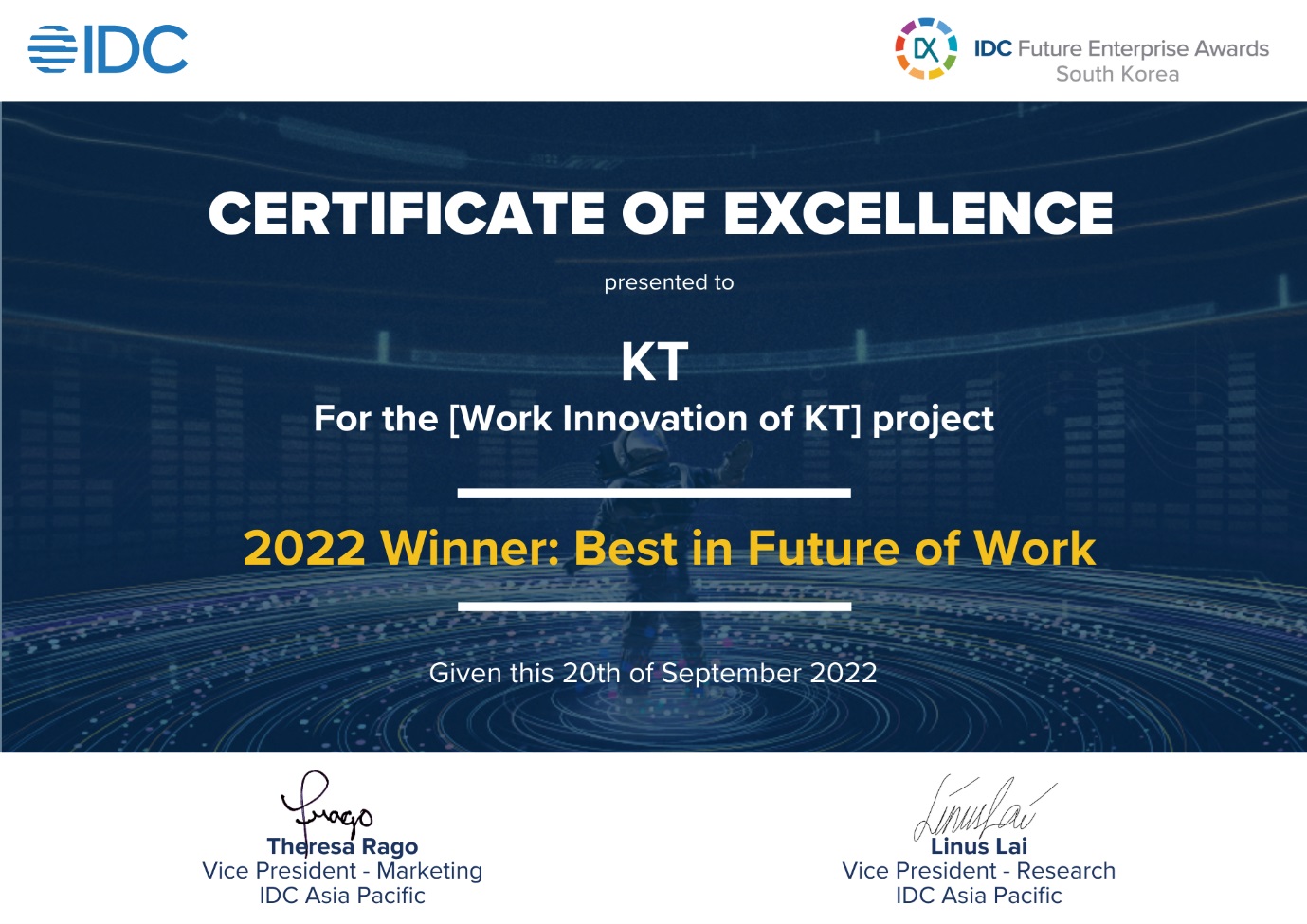 KT는 업무혁신 프로젝트 ‘워크 이노베이션(Work Innovation)’의 성과를 인정받아 글로벌 IT 시장분석기관 IDC의 ‘2022년 IDC 퓨처엔터프라이즈(Future Enterprise) 어워드’에서 ‘미래의 업무(Future of Work)’ 부문 수상사로 선정됐다고 26일 밝혔다.