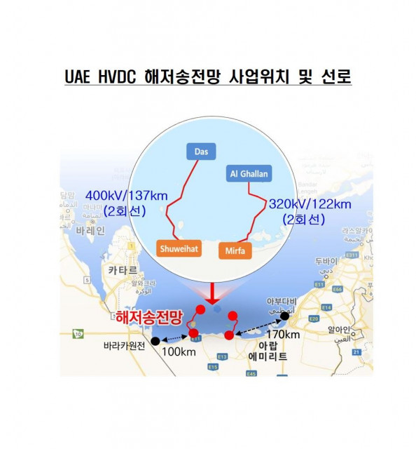 특히 청정에너지(원자력, 재생에너지) 인증서(CEC, Clean Energy Certificates) 거래 시장이 개설된 UAE에서 본 HVDC 해저 송전망이 준공되면 한전이 건설한 바라카 원전 등 육상에서 생산한 청정에너지를 해상 석유·가스 생산 설비에 직접 공급함으로써, 기존 노후화된 해상 가스 발전 설비를 대체해 약 30% 탄소 감축에 기여할 것이다.