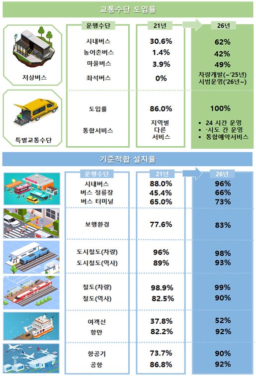 이를 통해 시내버스의 저상버스 도입률은 지난해 말 기준 30.6%에서 2026년까지 62%로 높이고 농어촌버스는 1.4%에서 42%, 마을버스는 3.9%에서 49%까지 늘린다는 방침이다.