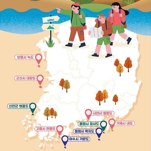 이번 ‘가을 섬’은 울긋불긋 아름다운 단풍과 꽃을 감상할 수 있는 ‘물들었 섬’(2곳), 누구나 걷기 좋은 길이 있는 ‘걸어봐 섬(’5곳), 맛있는 제철 음식을 먹을 수 있는 ‘맛있 섬’(2곳)이다.