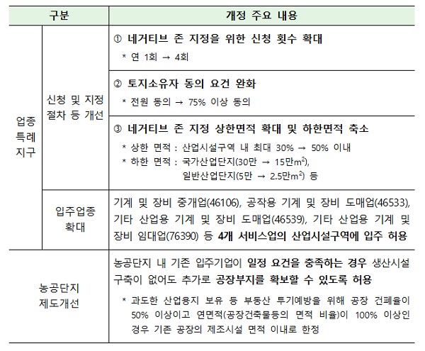 산업부는 산단 업종특례지구 신청 및 지정 절차 개선을 위해 우선 신청 횟수를 연 1회에서 4회로 확대하고, 네거티브 존 지정을 위한 토지소유자 동의 요건을 전원 동의에서 3/4 이상 동의로 완화했다.