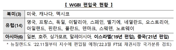 세계국채지수는 23개 주요국 국채들이 편입돼 있는 선진 채권지수로 자금 규모만 2조 5000억 달러로 추정되는 세계 최대 채권지수이다. 한국이 WGBI에 편입될 경우, WGBI 추종자금을 중심으로 50조~60조 원의 외국인 국채 투자가 유입될 것으로 추정된다.