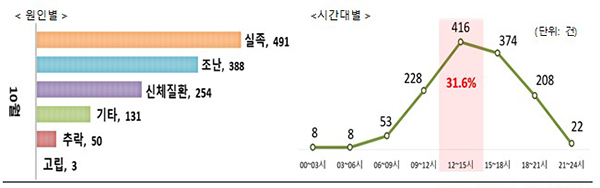 시간대별로는 점심시간 이후인 12시에서 오후 3시 사이에 31.6%(416건)로 가장 많이 발생했고, 해가 지고 어두워지는 오후 6시 이후의 사고도 17%(230건)나 차지하고 있어 각별한 주의가 필요하다.