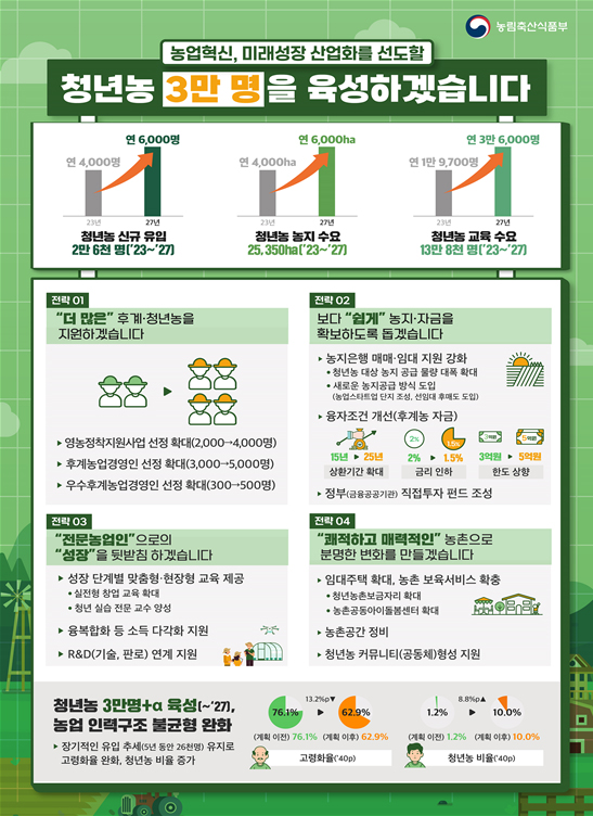 농식품부 관계자는 “이번 계획을 통해 2027년까지 청년농 3만명을 육성하고 이후에도 유입 추세를 이어간다면 2040년에는 청년농 비중이 10%까지 증가할 것으로 기대한다”며 “이를 통해 농업생산기반을 안정적으로 유지하고 창의력과 혁신 능력을 보유한 다양한 배경의 청년농 유입으로 농업의 혁신과 미래성장산업화를 뒷받침하겠다”고 밝혔다.