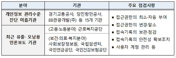 공공부문 개인정보 관리수준 진단 미흡기관과 최근 개인정보 유출 및 오남용 의심사례 등이 발생한 기관을 포함한 총 20개 기관에 대해 개인정보 실태점검을 하기로 했다.