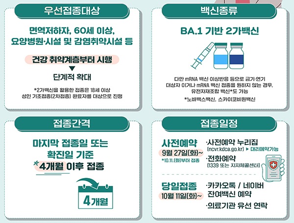 이번 접종은 면역저하자와 요양병원·시설, 정신건강증진시설, 장애인·노숙인 시설 등 감염취약시설 입원·입소·이용·종사자 및 60세 이상 연령층 등 건강취약계층부터 우선 시행한다.