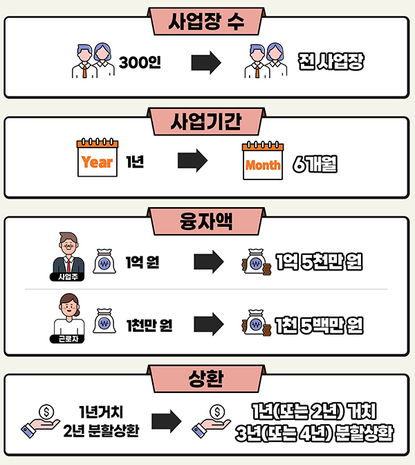 이와 함께 융자 상환 기간에 대한 선택권을 1년 거치·2년 분할상환에서 1년(또는 2년) 거치·3년(또는 4년) 분할상환으로 넓혀 사업주가 경제적 여건에 따라 융자금을 변제할 수 있도록 한다.